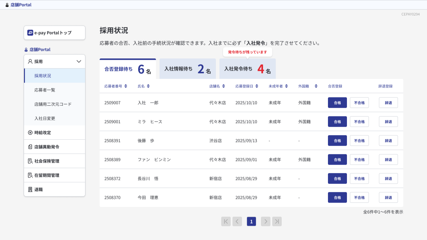 権限を保持している店舗のP/A応募者の「合否」または「辞退」をシステム登録し、後続の入社情報申請および入社発令の進捗管理を行います。店舗名はもちろん、各種条件でソートすることで対応漏れを防止します。