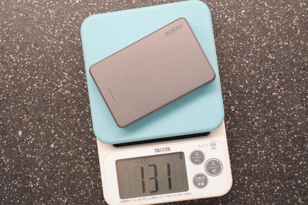 モバイルバッテリー単体での重さは131g。同スペックのモバイルバッテリーの中でも最軽量とはいかないものの、許容範囲内の重さだと思います。