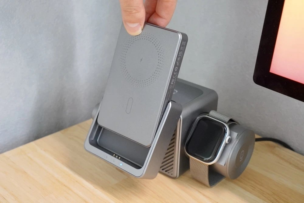 iPhone・Apple Watch・AirPodsの3台をスマートに同時充電できる構造に加え、着脱式のモバイルバッテリーという柔軟な運用性を備える点が、本機の大きな魅力です。