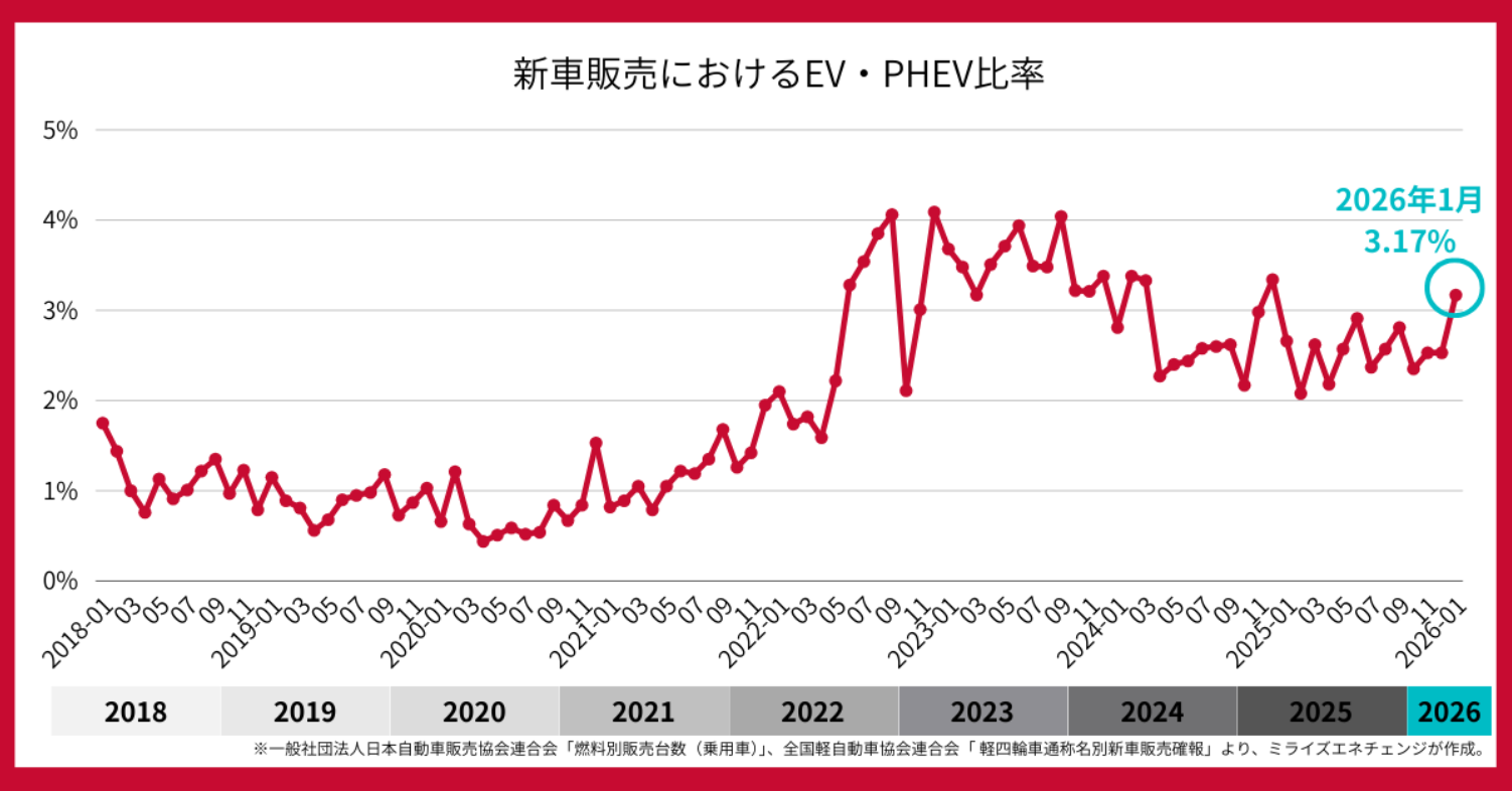 魅力的な車種の増加に伴って、新車販売におけるEV・PHEVの構成比は2026年1月に上昇し、EV市場には足元で前向きな変化が生まれつつあります。補助金制度の拡充や新型電動車の投入が進んだことに加え、2025年のJADA統計では日産・トヨタ・輸入車のEV・PHEV販売が前年同月を大きく上回るなど、メーカー各社の本格的な商品投入が市場の転換点となりつつあります。