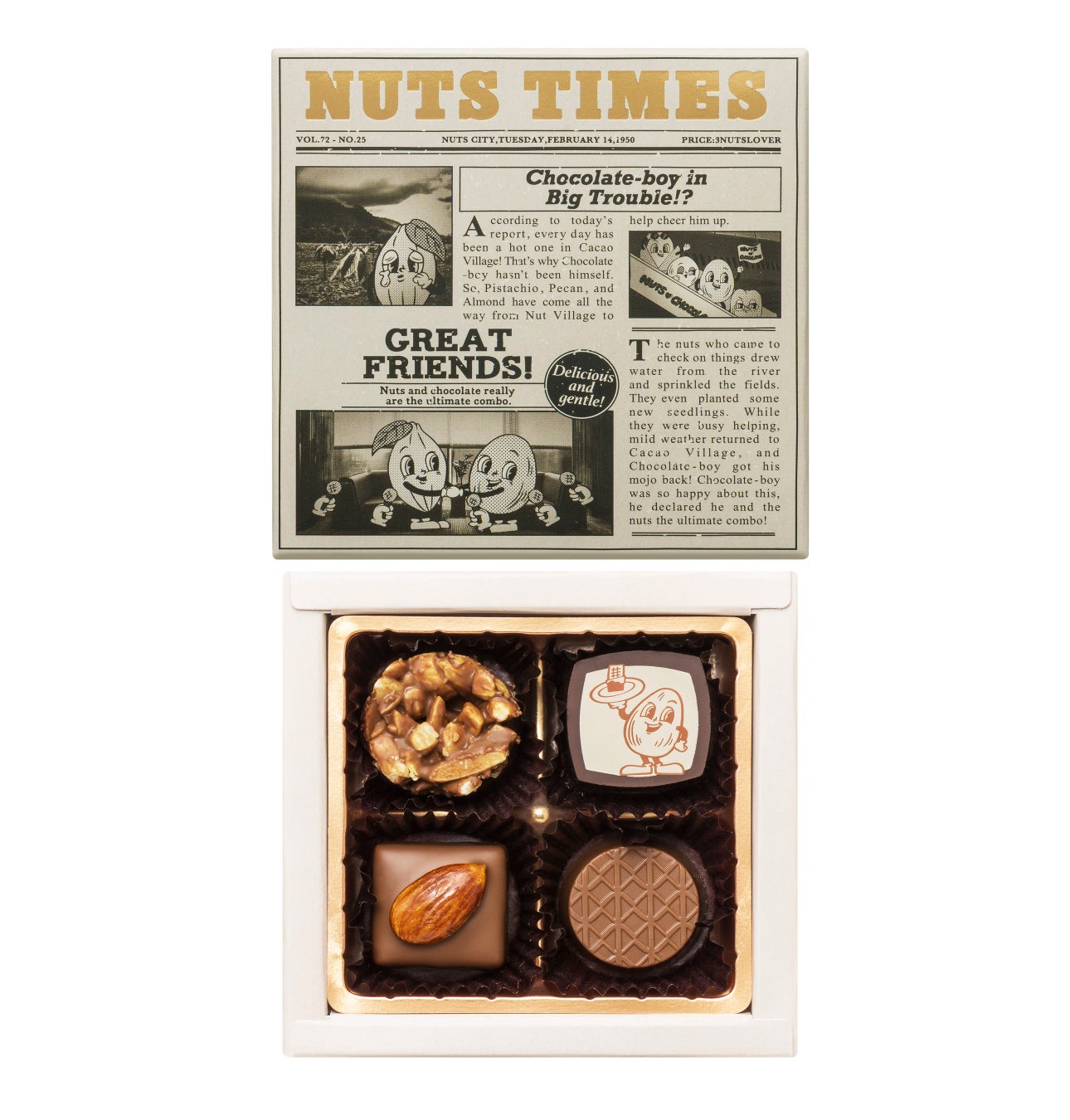 ナッツに特化したチョコレートを堪能できるバレンタイン専用ブランドです。アーモンドやペカンナッツなどいろいろなナッツを組み合わせ、様々な食感で仕立てたチョコレートの美味しさと、オリジナルキャラクターを登場させたポップ感とレトロさのある〈アメリカンレトロ〉の世界観で表現しました。