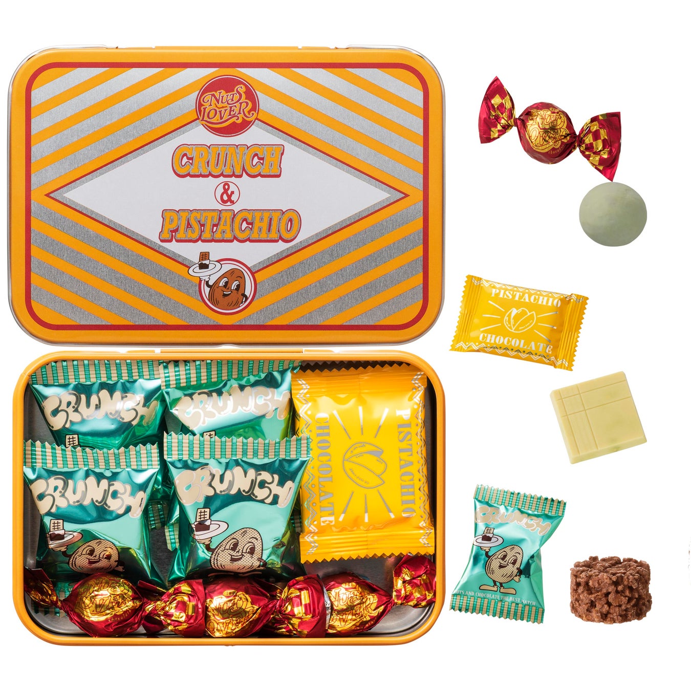 サクッとした食感が楽しいアーモンド&ミルクチョコレートクランチ、まろやかなピスタチオトリュフ、香ばしいピスタチオの風味感じるスクエアチョコレートが入ったボックス。黄色のストライプ柄がおしゃれな蝶番付きの缶です。