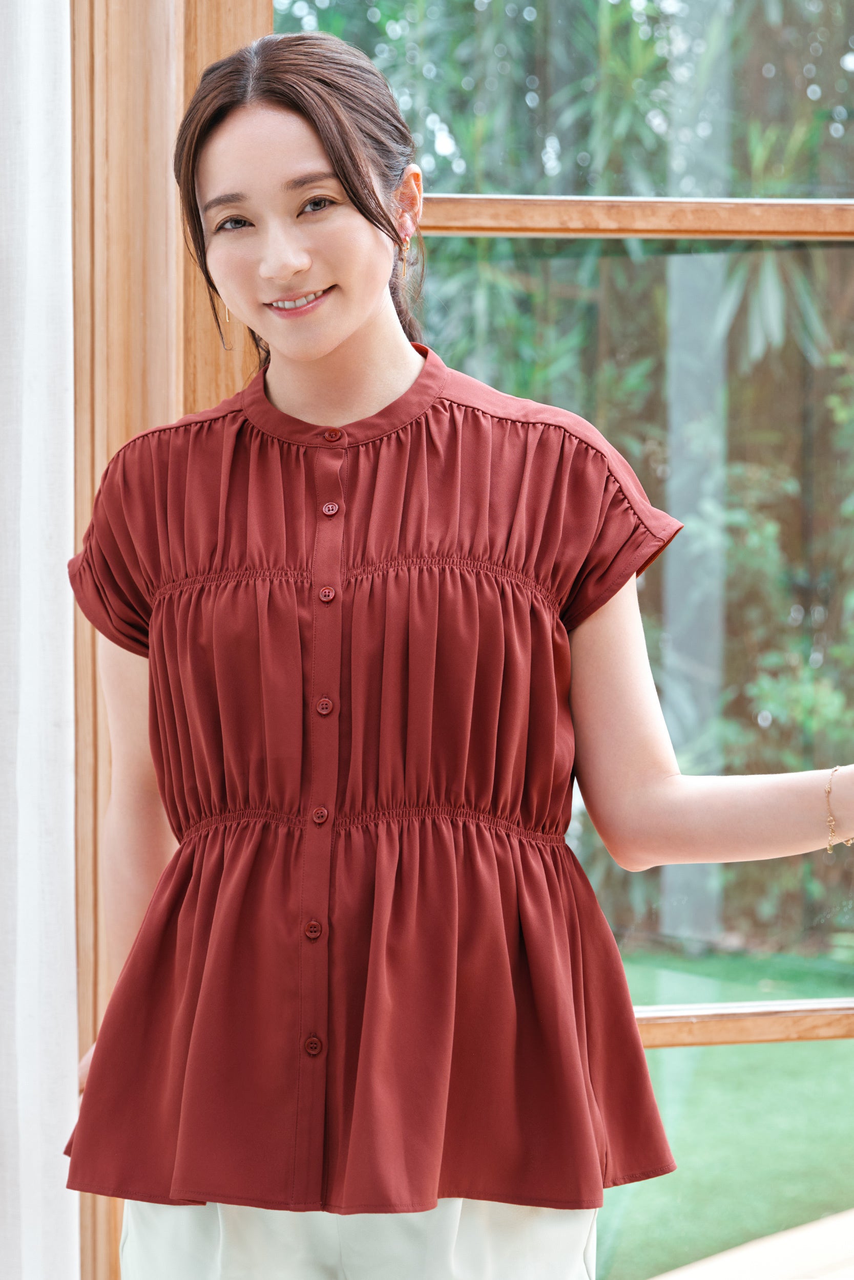 【Honeys(ハニーズ)】木村文乃さんコラボカラーのシャーリングブラウス発売。4月28日(火)よりハニーズ公式オンラインショップにて特設ページ公開