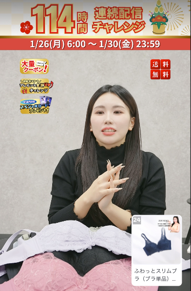 化粧品やアロマ商品を展開する株式会社フォーシーズHD(所在地:福岡市中央区、代表取締役社長: 松野博彦、東証スタンダード市場 証券コード:3726)の子会社である株式会社iiyが、ライブコマース専門事務所「トキバナ」が運営するライブコマースチャンネル「ぞうねこちゃんねる」の、2026年1月26日(月)のライブ配信にて、下着ブランド「CHARM MAKE BODY」のブラジャーを約100万円分、合計442枚販売。一部サイズやカラーが完売となるほど、話題となりました。