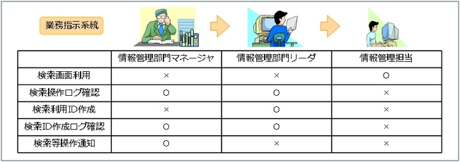 操作権限をシステム管理者内で分散させることで、管理者側からの情報漏えいも防ぎます。検索操作やID作成のログはメールでシステム管理部門の責任者へ通知されるため、悪用を抑止します。