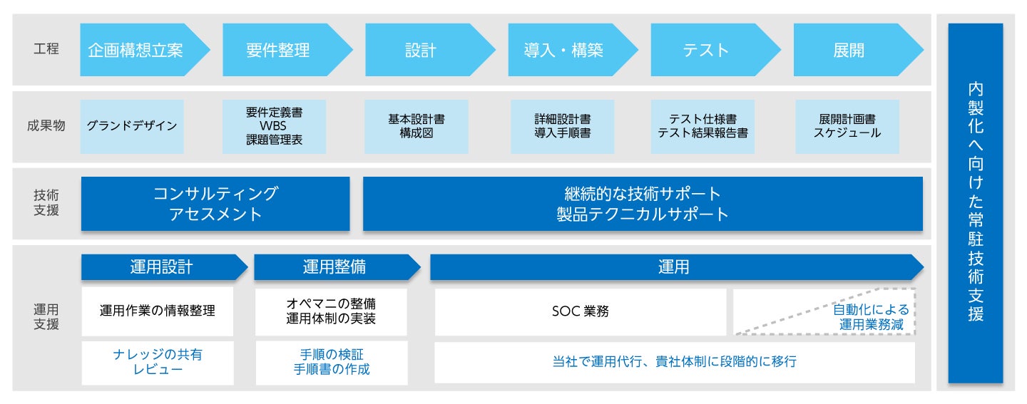 従来の境界防衛型ネットワークからゼロトラストモデルへの刷新を検討している企業の、企画・構想・立案〜運用まで全工程をサポートしています。また、常駐支援サービスを提供している別部門とも連携することで、導入だけでなく継続的なアフターサポートや内製化の支援まで幅広く対応しています。