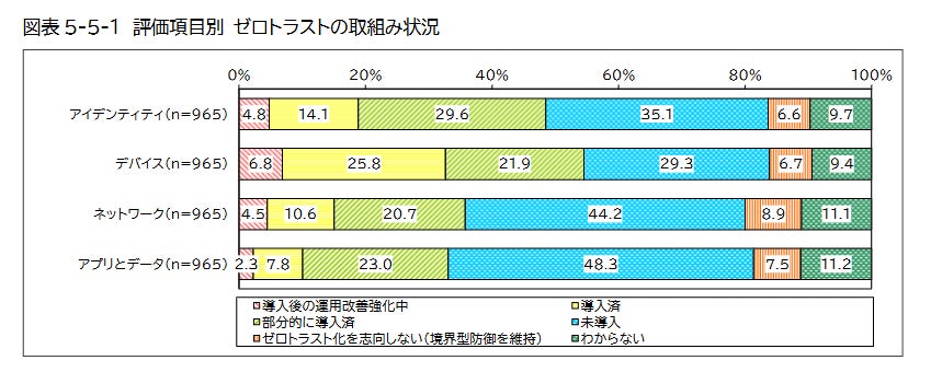 ゼロトラスト市場は急成長を遂げており、企業の30%以上がゼロトラストへの取り組みを進めていると報告されています。しかし、「部分的に導入済み」や「未導入」の企業も依然として多く、市場規模としては50〜70%の成長余地が残されています。