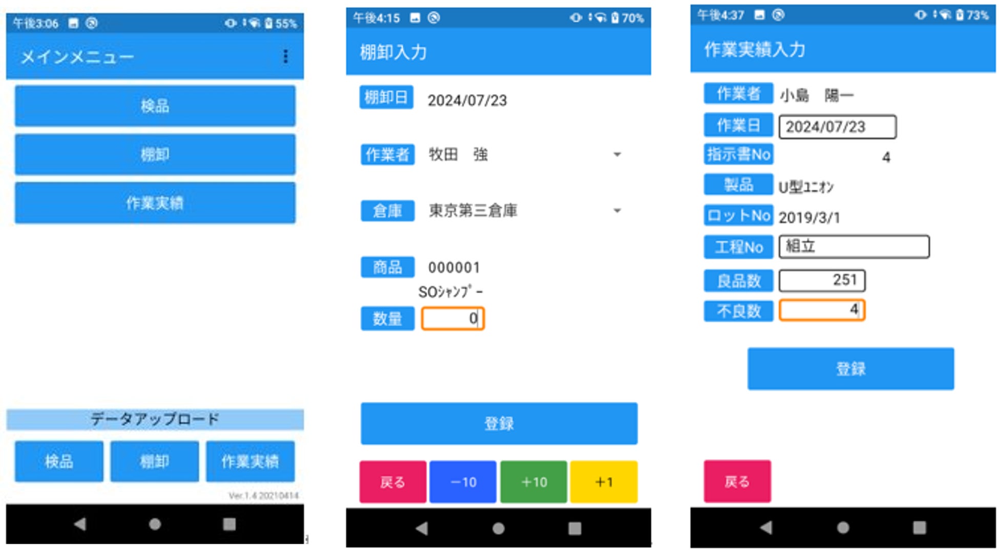 「棚卸」「検品」「作業実績」の3種類のアプリケーション
