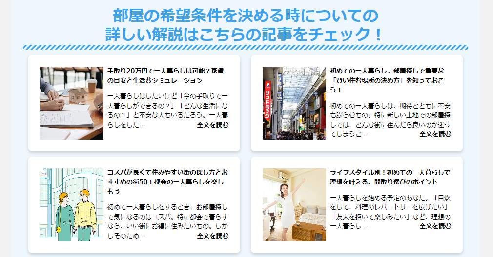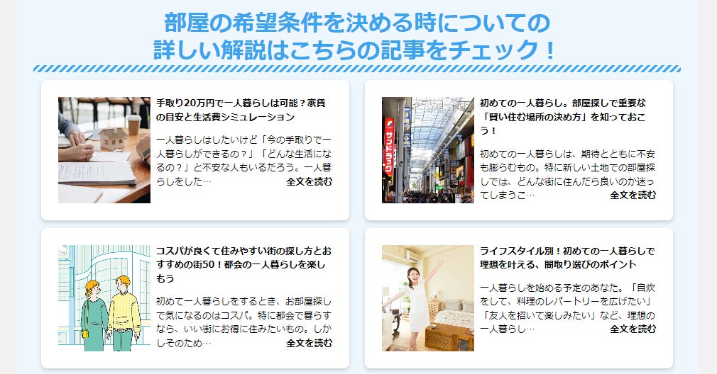 CHINTAIが運営するライフスタイルメディア「CHINTAI情報局」では、これまでに「お部屋探し・引越し・賃貸の基礎知識・お部屋探訪」など、暮らしにまつわる記事を3,000件以上掲載しております。今回リニューアルした「お部屋探しガイド」では「すぐ見てわかる」ように、より詳しい解説を記事でご覧いただけるように工夫しています。