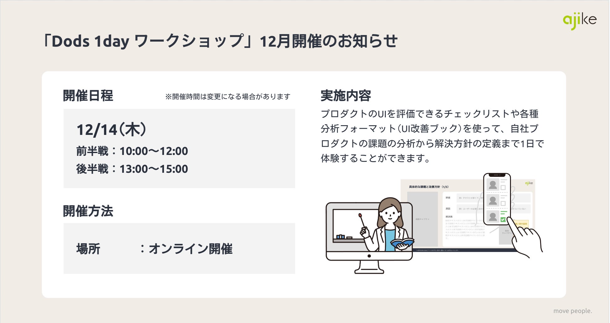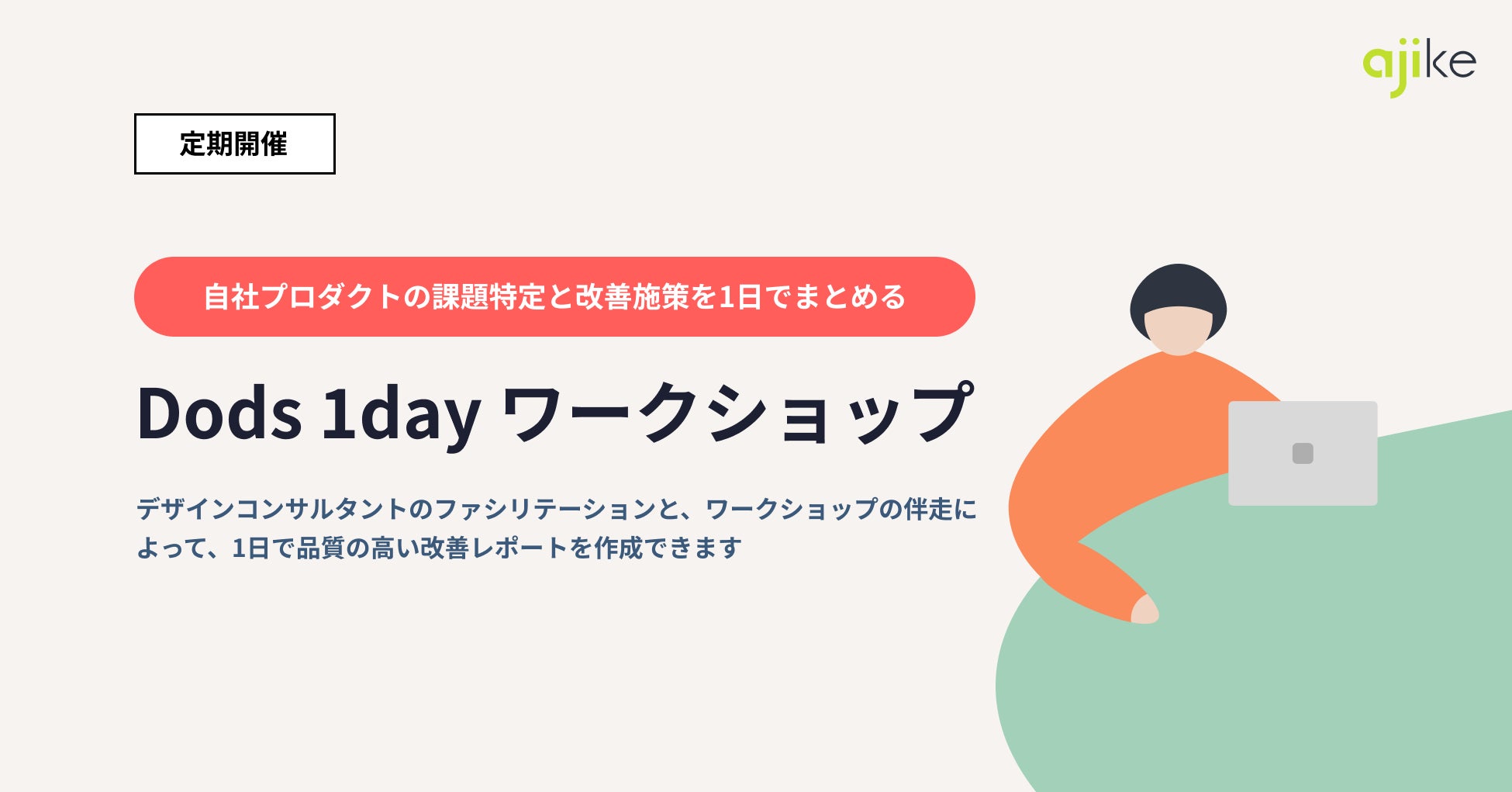 新たに提供する【Dods 1dayワークショップ】はお客様のプロダクト課題の発掘から解決までのワークフローを1日で学ぶことができるワークショップです。このワークショップを通じてアジケは使いづらいプロダクトの改善をサポートします。