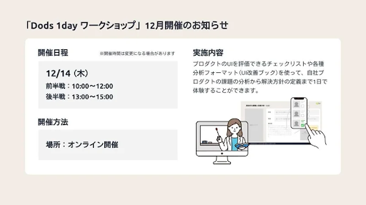 自社のプロダクトにおいて、「ユーザーからの評価が悪い」、「使いづらい」、「なんとなく古い感じがする」などの悩みをもつ企業様が多くいらっしゃいます。ですが、悩みを解決する方法やそもそもの「課題」を発見することも難しいと感じるケースが大半。そんな課題を素早く解決するために、【Dods 1dayワークショップ】を開催いたします。