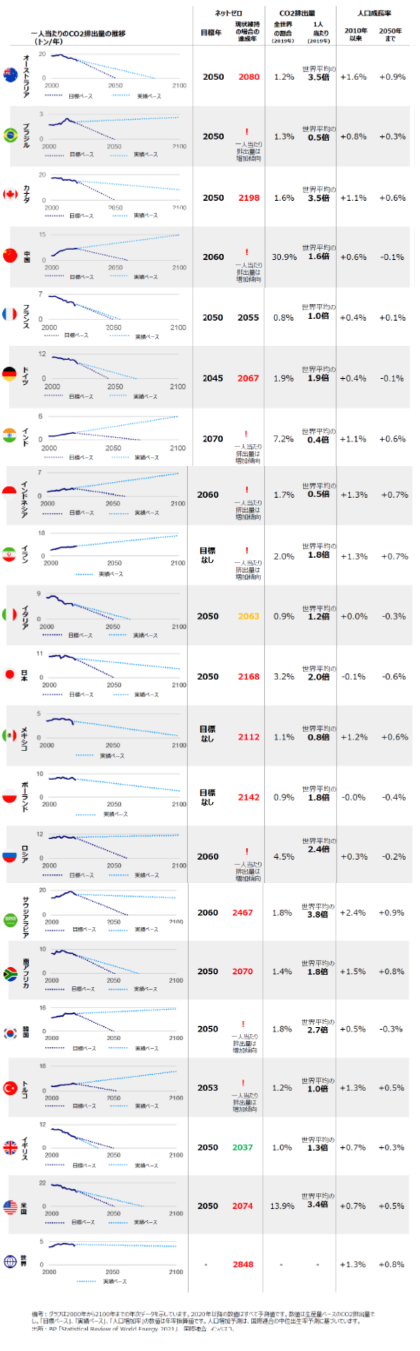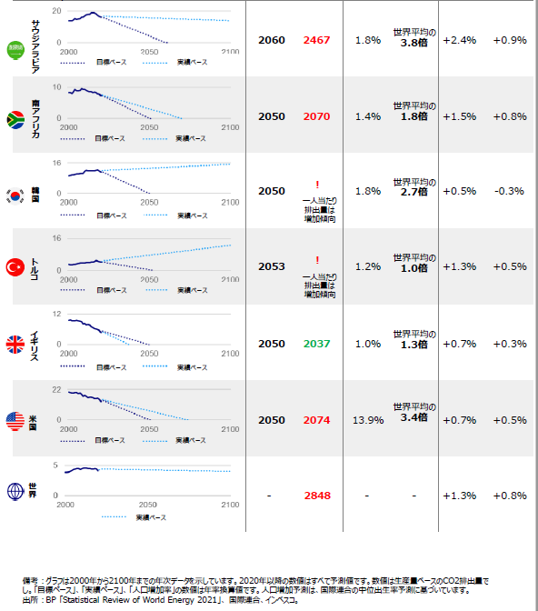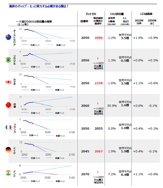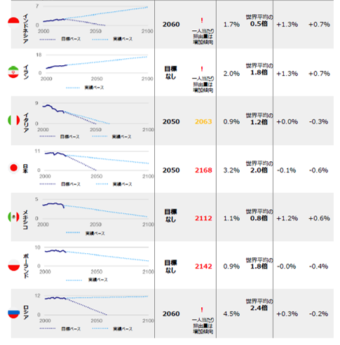 2050年にネットゼロ目標を達成するのはイギリスのみ。日本の達成見込みは2168年と試算