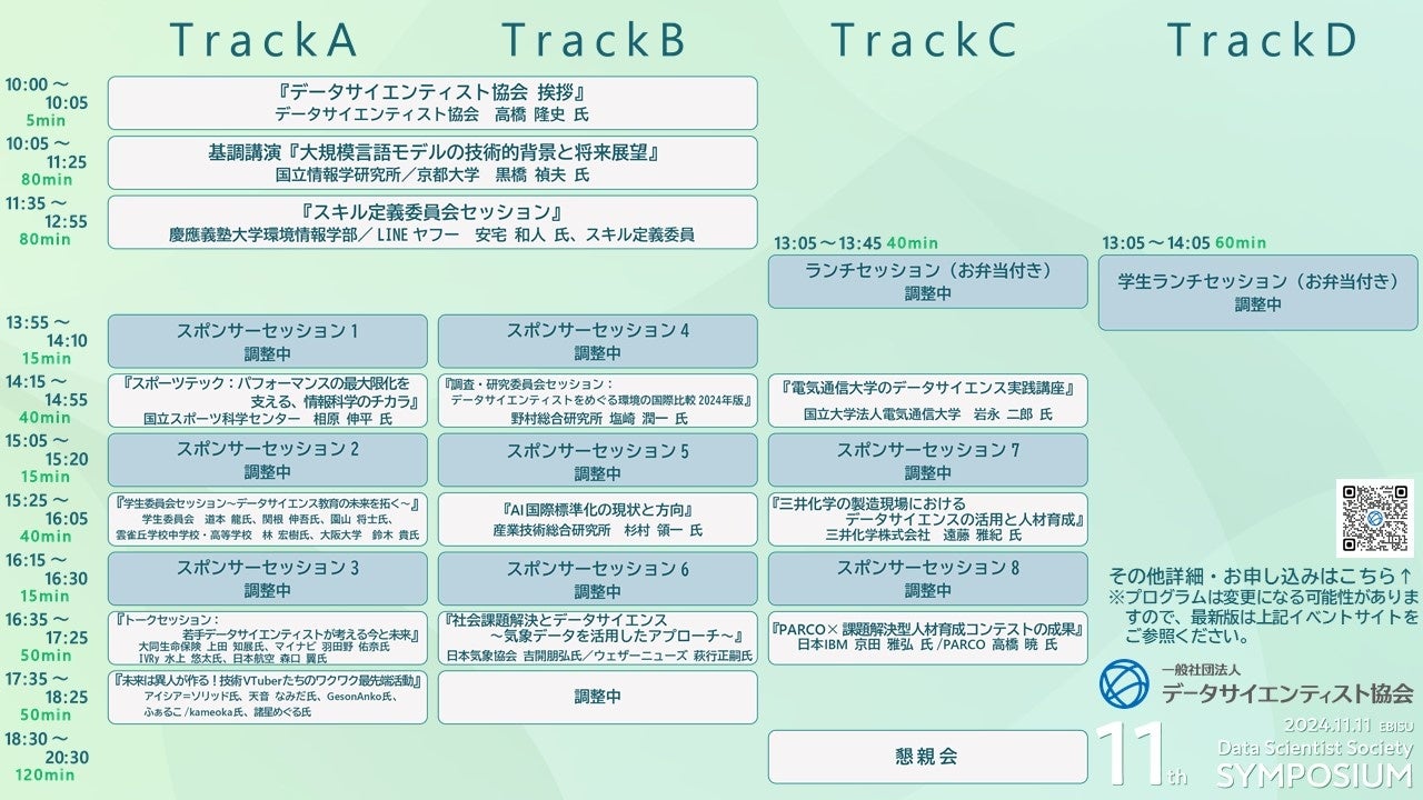 本イベントの最新情報ならびに一般参加者の申し込みは公式ウェブサイトにて受け付けています(事前登録制)。https://www.datascientist.or.jp/symp/2024/