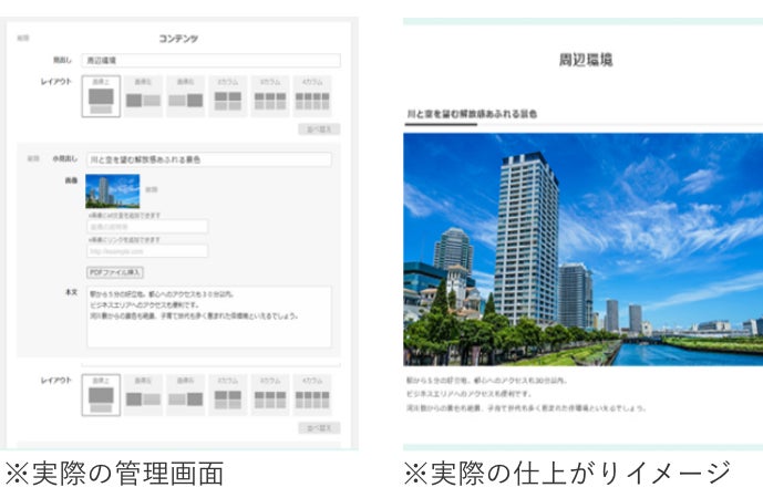 デザインテンプレートが用意してあり、管理画面から物件の写真や概要、周辺エリアの情報を入力するだけで特設サイトが完成。