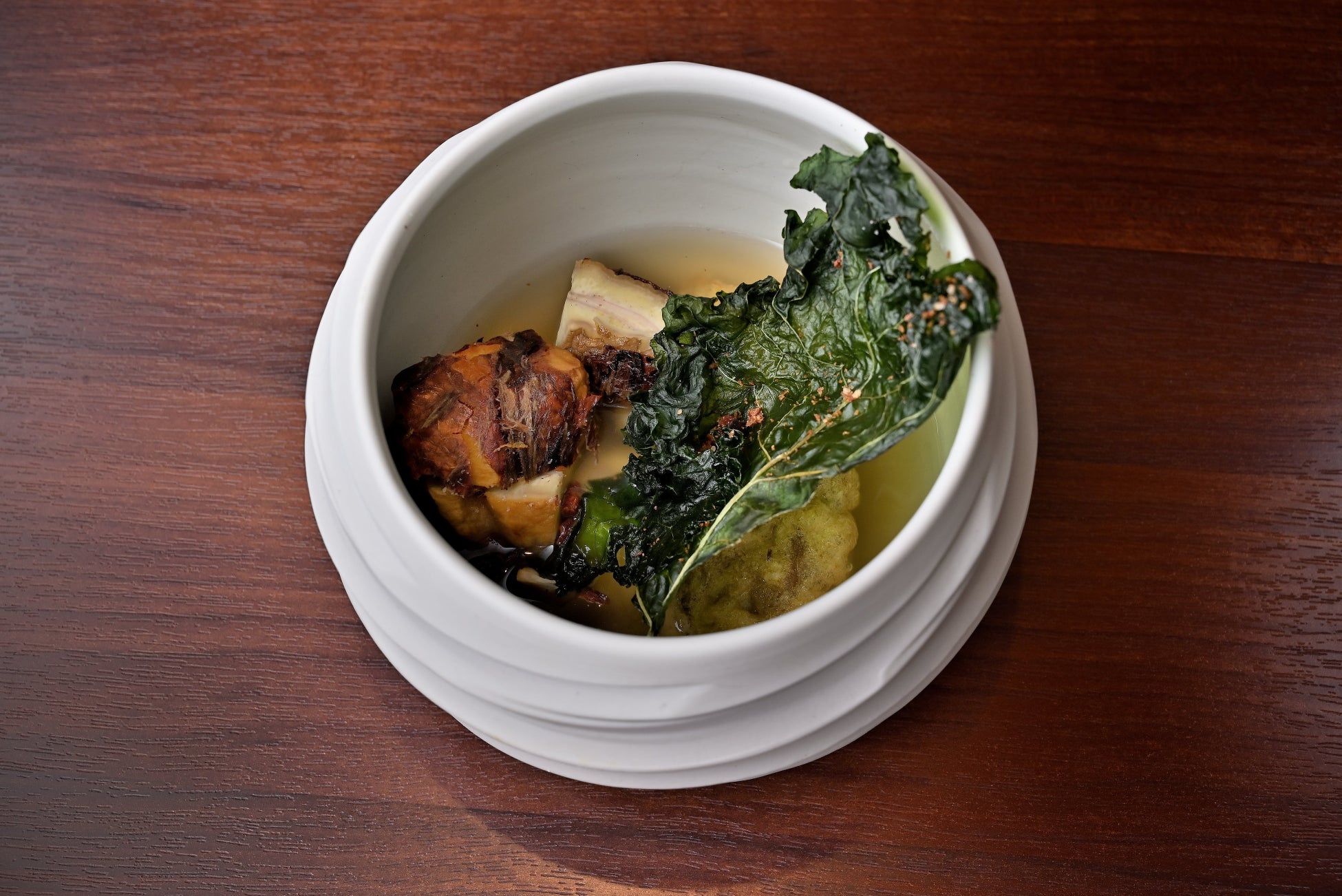 氷蔵熟成された「丹沢」の栗本来の味を活かすため、シンプルに調理。オーブンで1時間ローストして高温で揚げた栗を、とろみをつけたきじのコンソメと共に食する。卵の衣をまとわせて揚げた菊芋、低温で乾燥させたケールも添えられ、食感の変化も楽しめる一品。