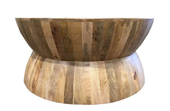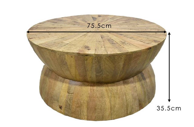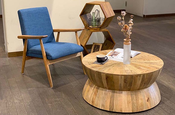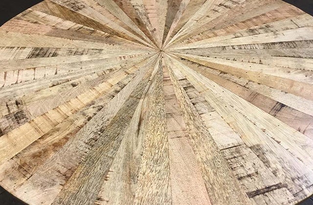ケーキのピースのような形を組み合わせた、まるで寄木細工のようなテーブル。ひとつひとつ手作りの工芸品です。天板は中心から放射状に広がる線やマンゴーウッドの天然木の素材感が楽しめます。丁寧に、繊細につくられた一品ですが、素直に表されている木目からは武骨さも感じられ、カフェ風でナチュラルな雰囲気だけでなく、ブルックリンスタイルやインダストリアルデザイン、カリフォルニアモダンなど、ハードめなテイストにも合わせることもできます。