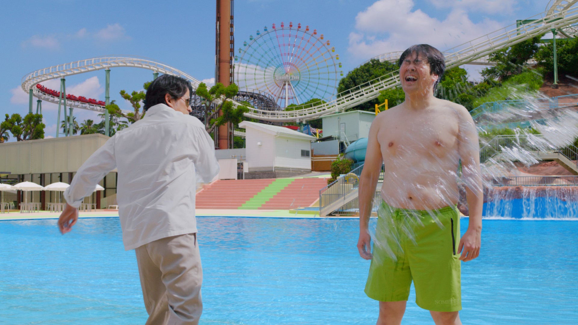 コップ一杯の水で、ひらパーの夏のプールの冷たさや気持ちよさをどう表現するか。それが今回のテーマでした。プールで急に水をかけられたとき「ヒャッ、冷たっ!」となるときの、あのプールならではのうれしさを、園長が見事ないきなり感によって水をかける動きで見せてくれました。園長が終始無言なのも、水をかけることがばれてしまうと「ヒャッ、冷たっ!」というビックリに、ならないから。園長のうれしい不意打ちで、CMを見ている方に水の気持ちよさを追体験してもらいたい、そしてひらパーに来てプールで本物の冷たさを味わってもらいたいと思います。