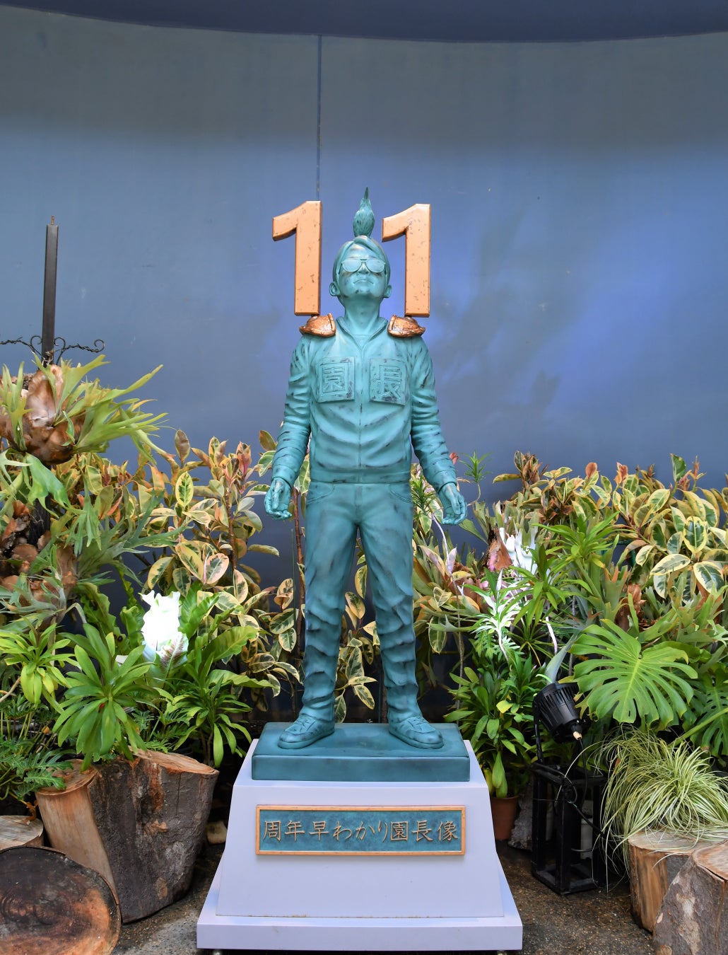 超ひらパー兄さん就任10周年で建立された岡田園長像。多くの来園者の方々に愛されるなか、あっという間に1年が経過したため、あらためて超ひらパー兄さん就任11周年を祝い、バージョンアップしました。11周年の今年のうちに、11周年を称え、11周年に映える写真をぜひ撮っておいてください。来年は左肩部分のみ‘ 2 ’にする予定。