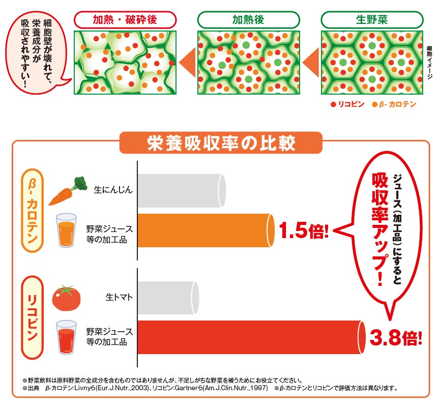 一方、野菜ジュースなどの加工品は、製造過程で、熱を加えられて柔らかくなり、さらに、細かく砕かれたり刻まれたりすることで、細胞壁が壊れ、栄養成分が細胞の外へ出やすくなります。