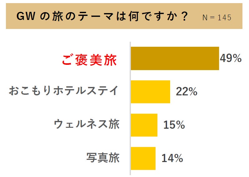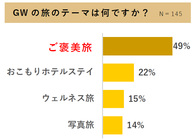 - ゴールデンウィーク旅のテーマは「ご褒美旅」が49%でトップ。