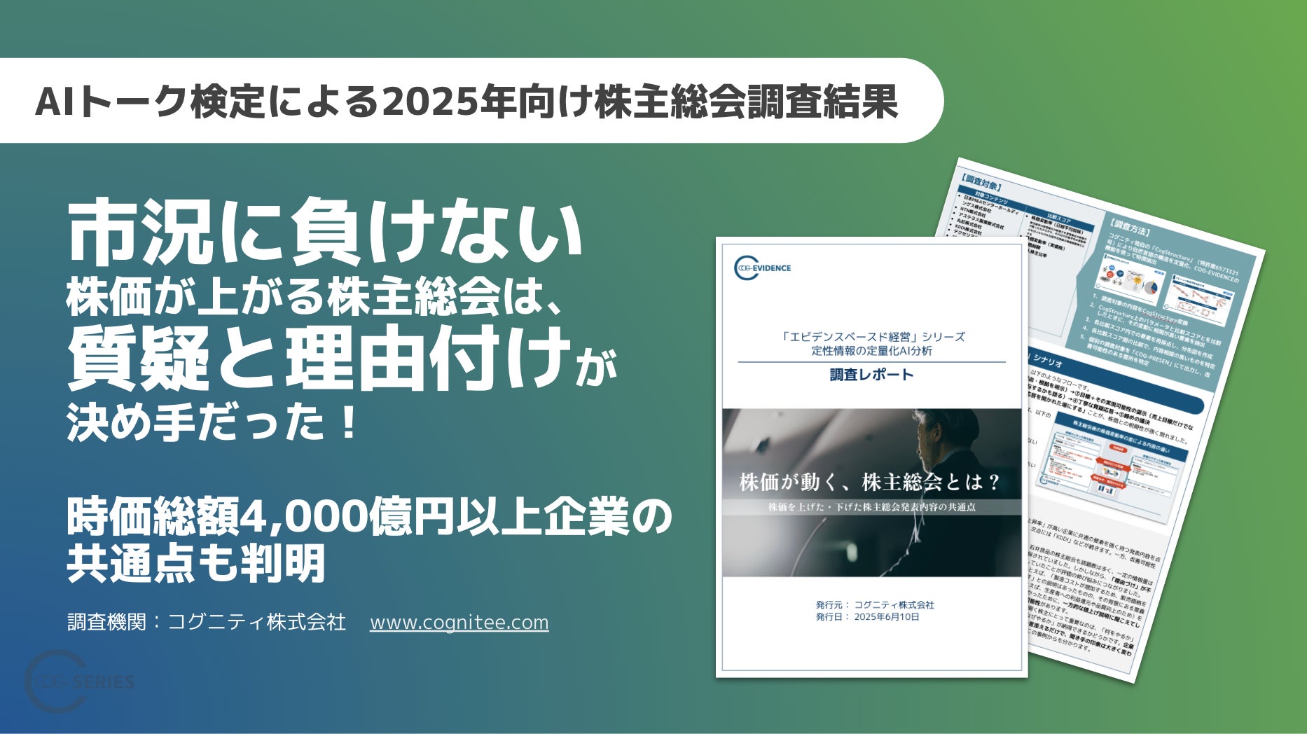 AIによる意思決定支援を手がけるコグニティ株式会社(本社:東京都品川区、代表取締役:河野 理愛、以下「コグニティ」)は、2024年6月に開催された上場企業15社の株主総会を対象に、説明内容と株価変動の関係を独自のAI技術で分析し、その調査結果「株価が動く、株主総会とは?」を発表しました。