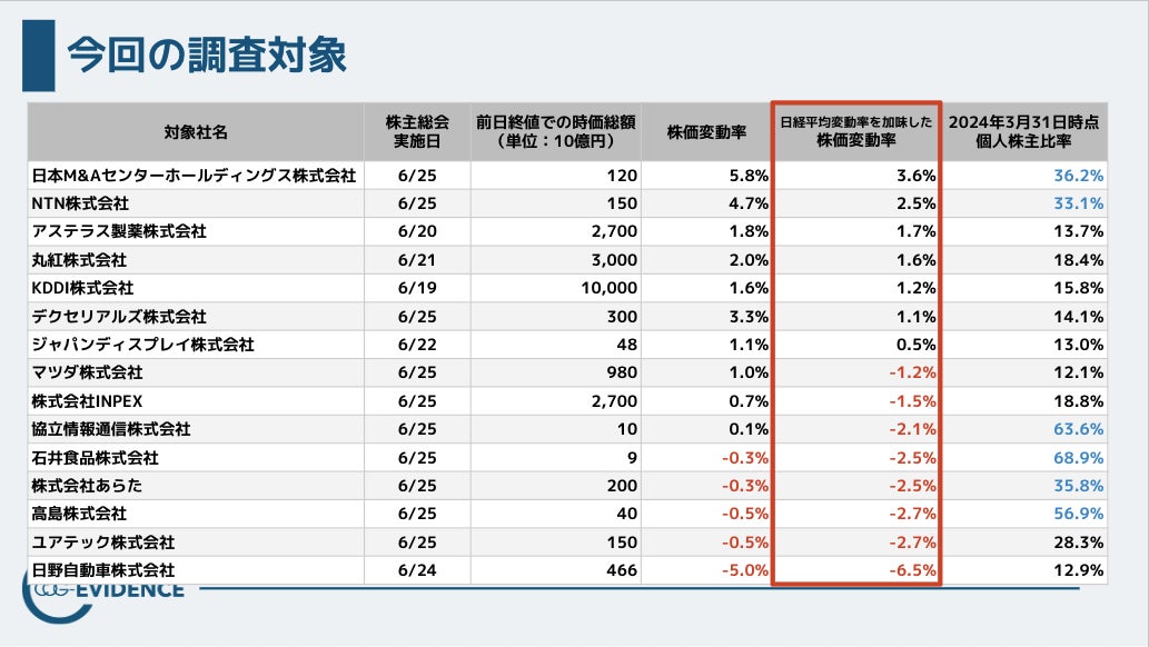 さらに注目すべきは、株主総会当日の日経平均株価が下落していたにも関わらず、個別株が上昇していた企業が複数存在したことです。これらの企業では、説明の順序や構成が論理的で、質疑応答の時間も充実しており、「市況にかかわらず企業努力が投資家に伝わった」と見られます。