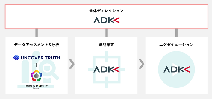 1stパーティデータ活用支援サービスの提供にあたっては、ADK MSとUNCOVER TRUTHが互いの得意領域で強みを発揮しながら協業してまいります。1stパーティデータの整備・分析は、UNCOVER TRUTHが主体となり、ADK MSと業務提携関係にある株式会社プリンシプルも携わります。データから得られたファクトを軸にしたコミュニケーション戦略全体のプランニングはADK MSが主体となって担当してまいります。さらに、策定した戦略に沿って購買や検討の実態に応じた効果的なエグゼキューションの立案も行います。