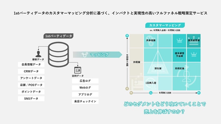 1stパーティデータの分析に基づいたプランニングで既存顧客の優良化を目指すとともに、データ分析から導き出す適切なアプローチで優良化に繋がりやすい見込み客の獲得に繋げることが可能となります。このサービスの提供によって事業ブランドADK CONNECT内にて体系化しているソリューションの一つ「優良顧客発見・育成プロセスマネジメント」(※1)の強化を図ります。