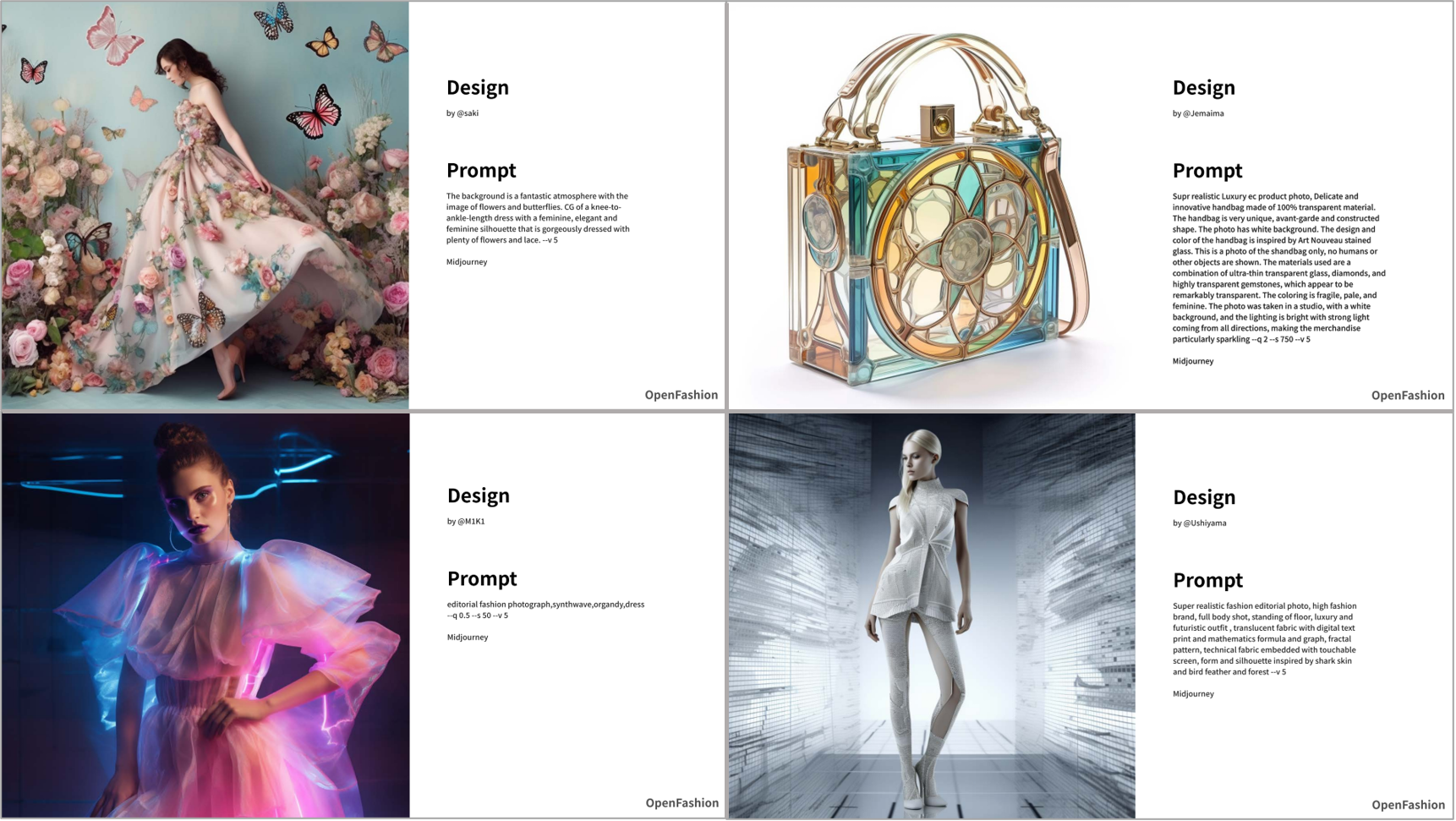 今回発表した「OpenFashion Design Prompt Book #1」は、テキストの説明文からリアルな画像を生成するジェネレーティブAI技術「Midjourney(ミッドジャーニー)」を活用して作成したデザインを1冊の本のようにまとめたものとなります。洋服を中心に、バッグや靴などファッションアイテムのデザインと、そのプロンプトを約50点収録しており、どなたでも無料でご覧いただけます。