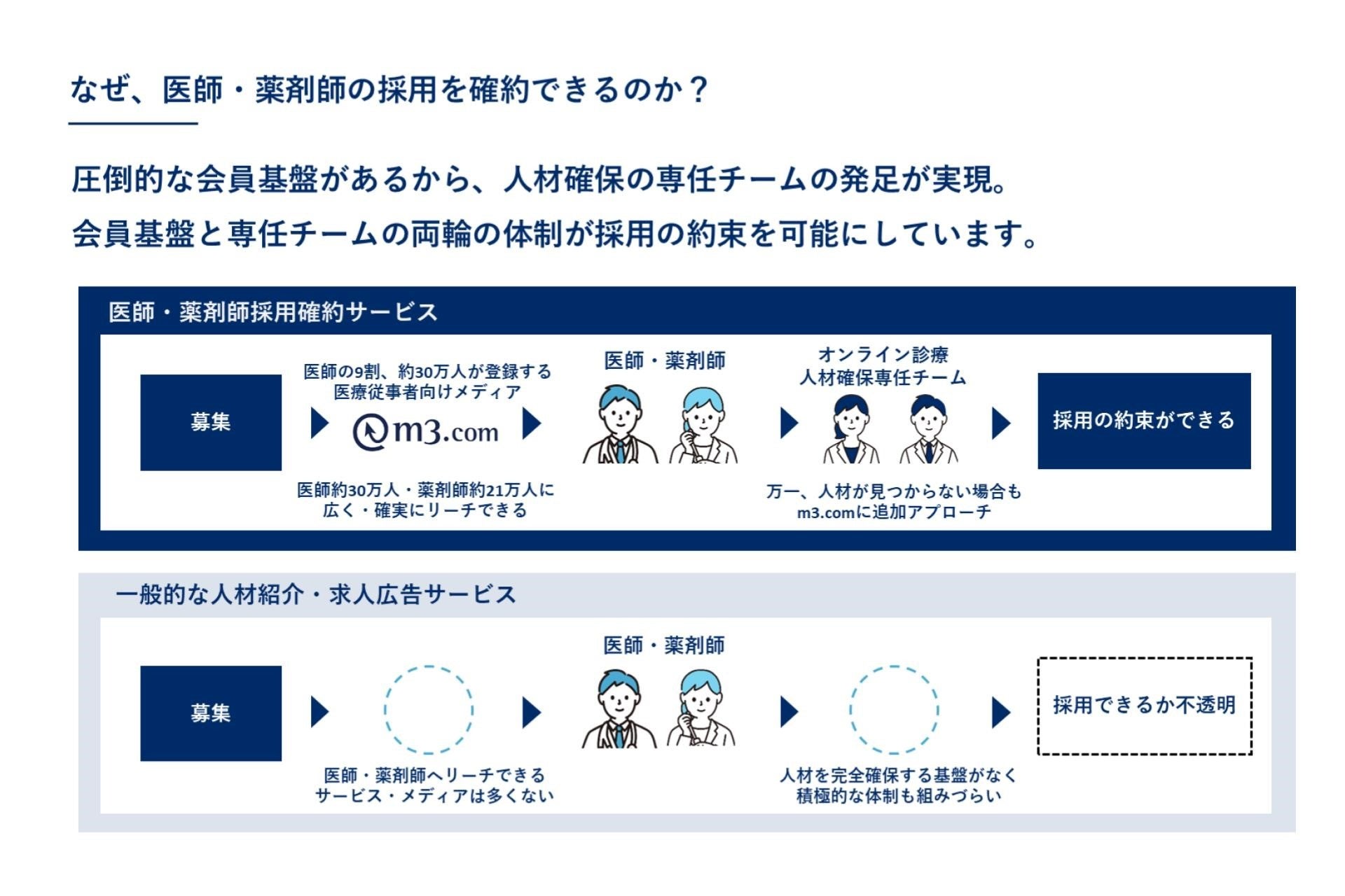 このような課題を解決すべく、エムスリーキャリアでは、オンライン診療業務に特化した医師採用確約サービスを新しく提供する運びとなりました。前述の新型コロナワクチン接種に続き、エムスリーキャリアが提供する医師採用確約サービスとしては第2弾となります。