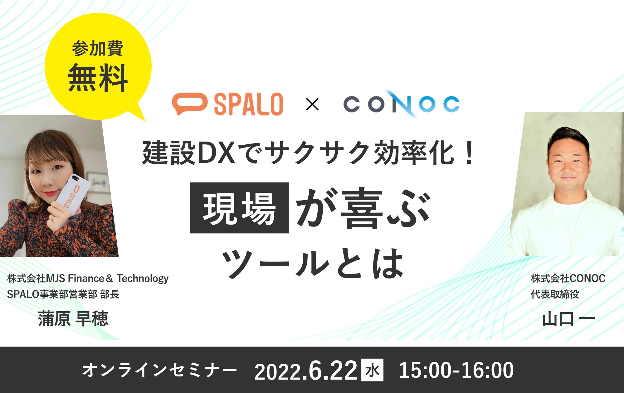| セミナーの流れ | 15:00-15:05 挨拶・登壇者紹介 15:05-15:30 「SPALO」でサクサク日報作成 15:30-15:55 「CONOCクラウド型業務管理システム」で書類作成効率化 15:55-16:00 お知らせ |