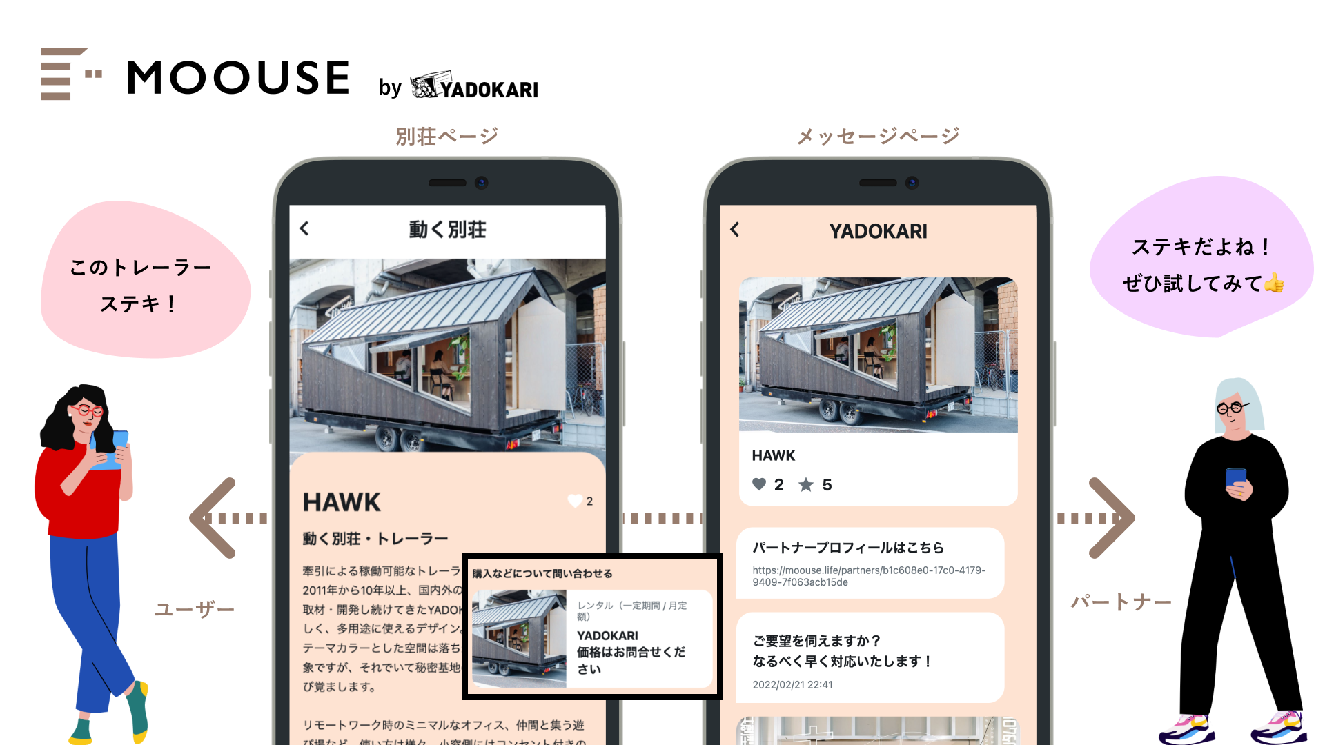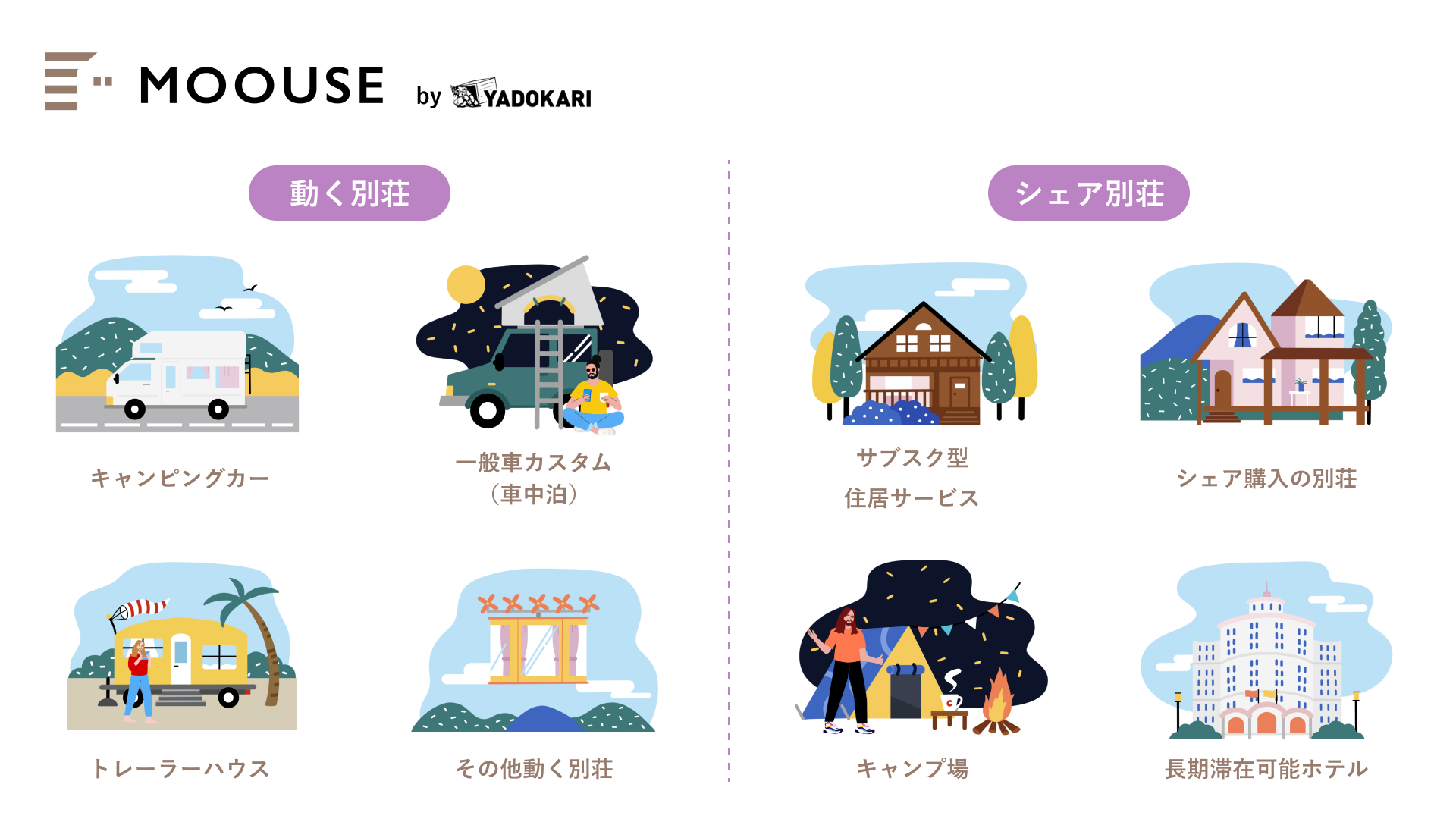 YADOKARIの新サービス「Moouse(ムウス)」では、継続的な「暮らし」で実践するにはまだハードルを感じる方に向け、まずは可動産やシェアなどによる短期での「旅」感覚での体験を増やすことで、少しずつ暮らしを変化させていくことにチャレンジしていきます。