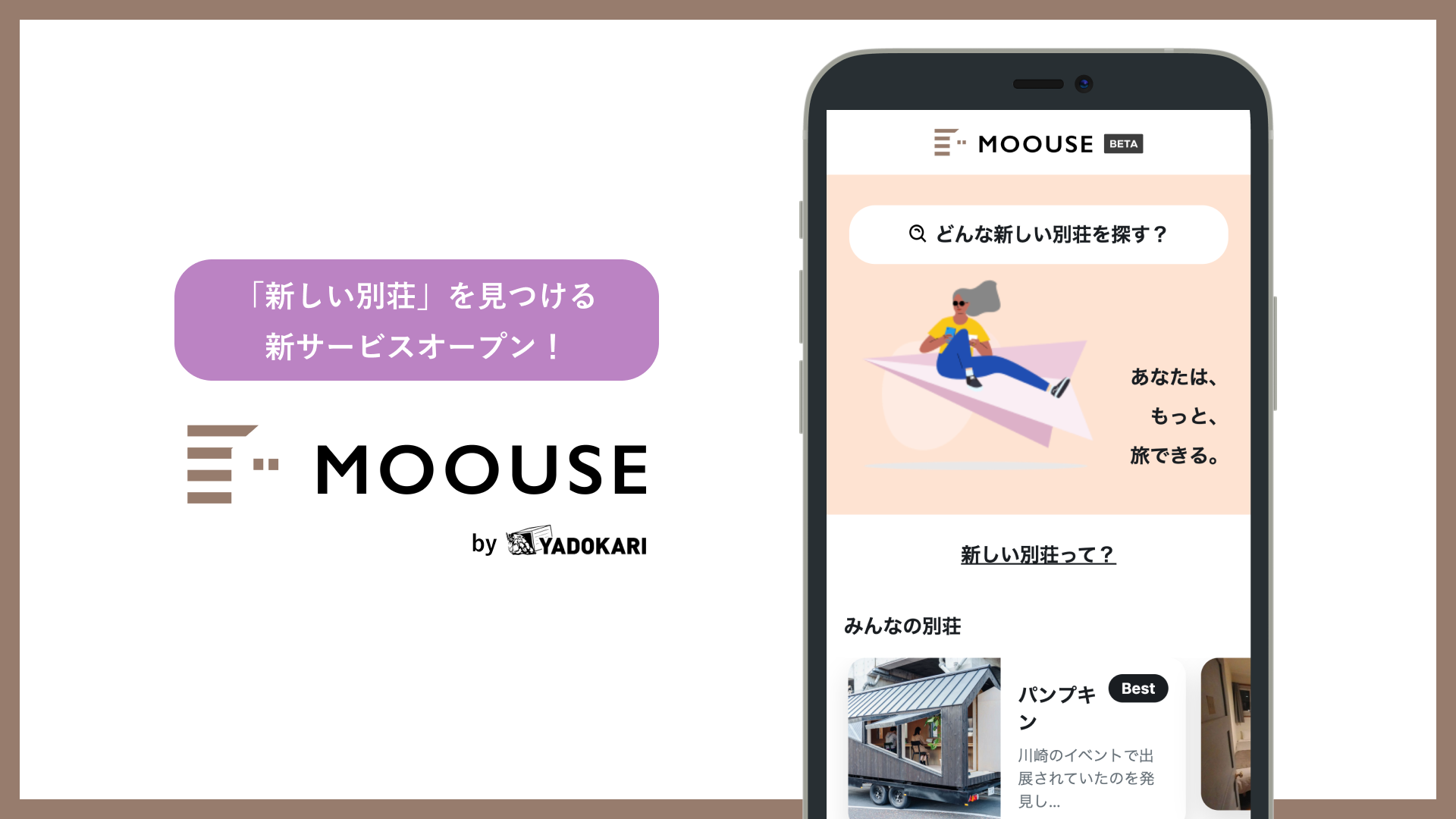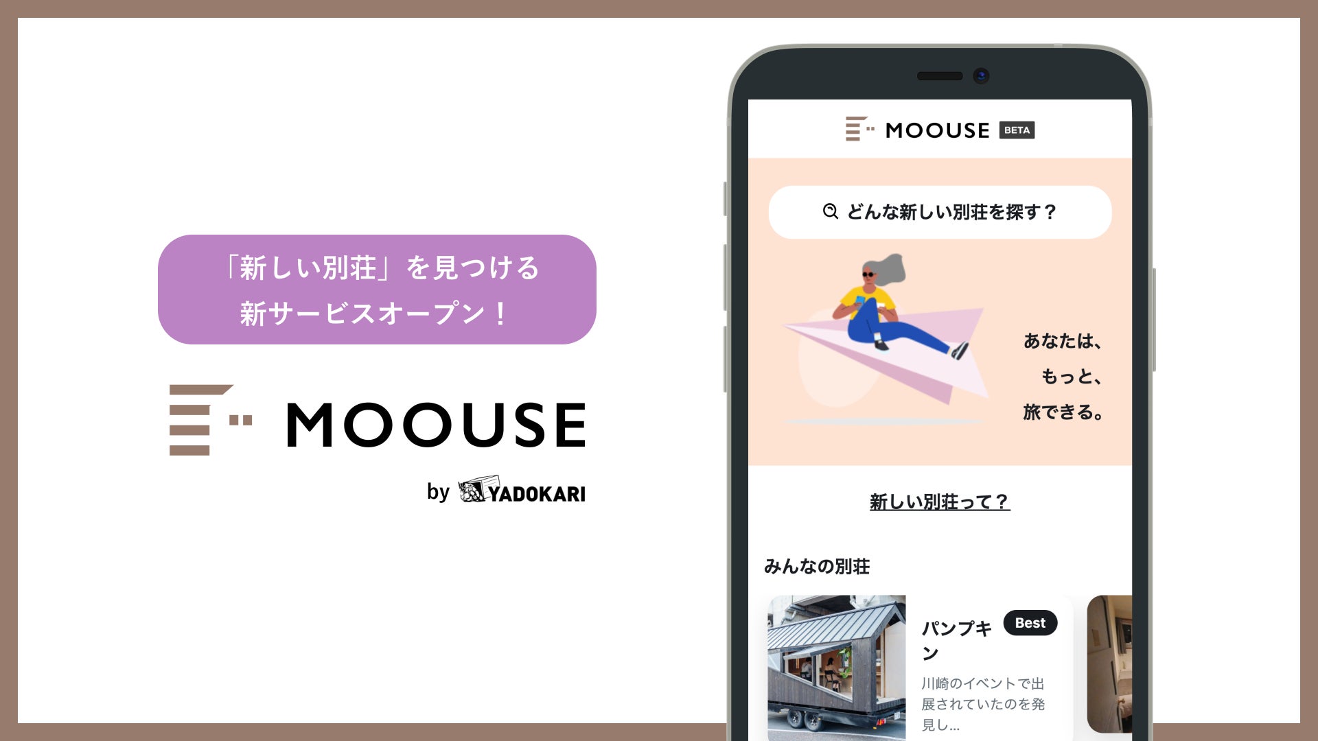 YADOKARI株式会社(神奈川県横浜市、代表取締役CEO さわだいっせい・代表取締役COO ウエスギセイタ、以下YADOKARI)は、個々人のライフスタイルに合わせて選べるプライベート空間 「新しい別荘」 に関する情報を取得、実践し、人生を豊かにできるWebプラットフォーム「Moouse」(https://moouse.life/)を2022年4月25日に公開いたしました。
