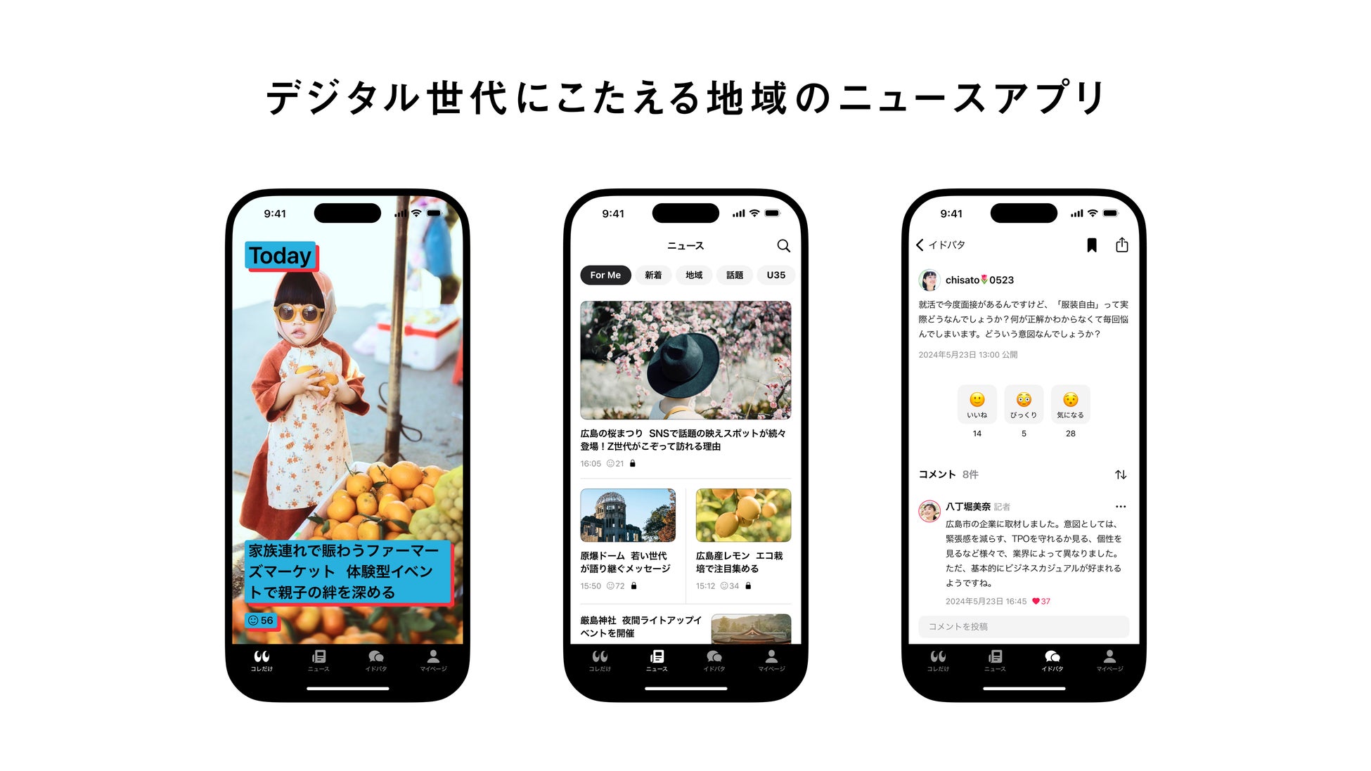 「みみみ」は、地方新聞社の強みである地域に根差した報道力を生かし、デジタル世代の関心に合わせたニュース体験を提供するアプリです。スキマ時間にニュースを見て楽しむ「コレだけ」機能や、意見や質問を投稿できる「イドバタ」機能などを搭載。デジタル世代が気軽に触れて、興味があるものを深掘りできるようデザインしています。
