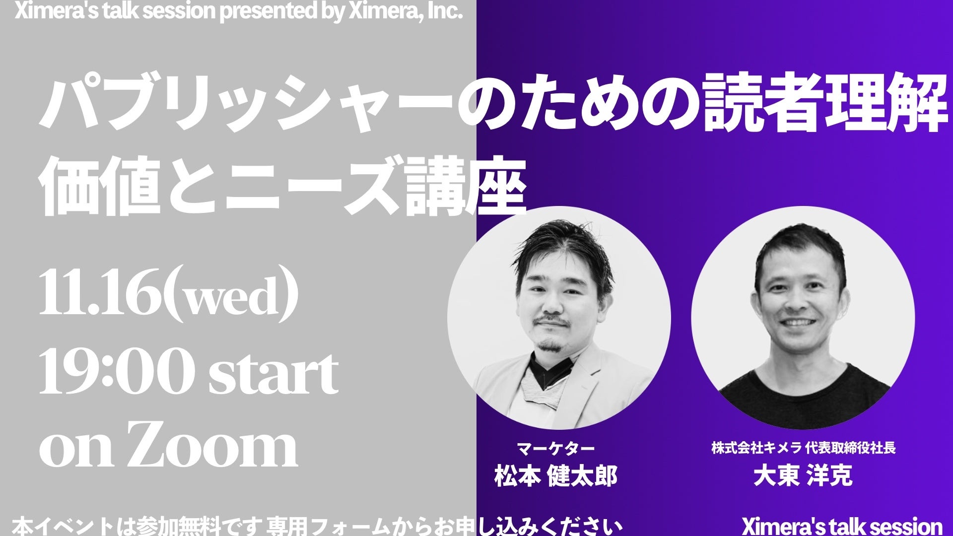株式会社キメラ(英文社名:Ximera, Inc.、本社:東京都渋谷区、代表取締役社長:大東洋克)は、無料オンラインイベント「パブリッシャーのための読者理解・価値とニーズ講座」を2022年11月16日(水)に開催します。