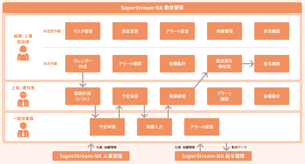 | 5 | SuperStream-NX給与との連携 | - 実績/締データはSuperStream-NX 給与管理へシームレスに連携可能 - 社員マスタ・組織マスタは勤怠システムへ連携 |