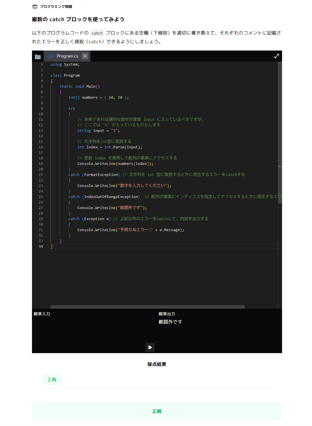 本コースが特に優れているのは、学習者が実際に手を動かし、ブラウザ上で直接プログラムコードを作成して動作を試すことができる点です。単に知識をインプットするだけでなく、豊富に用意された演習問題を通じてすぐにアウトプットできる実践的な環境が整っているため、プログラムの深い理解の促進と、確実なスキルの定着が大いに期待できます。