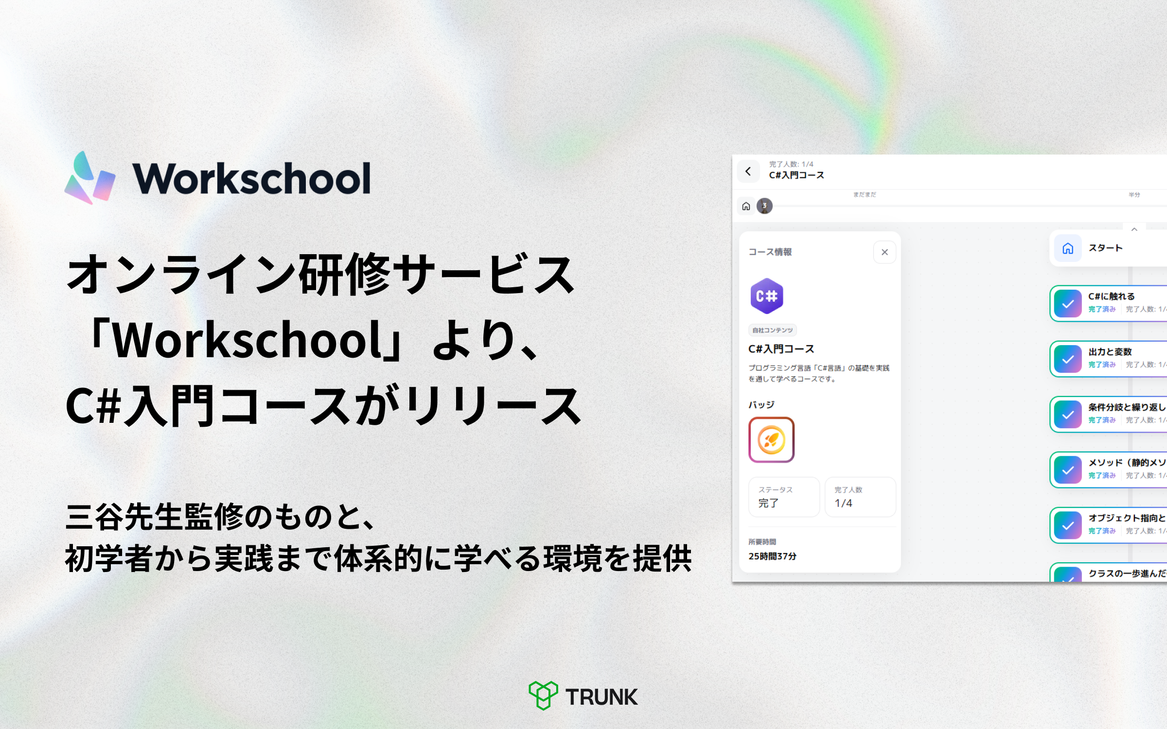 オンライン研修サービス「Workschool」を運営する、TRUNK株式会社(本社:東京都渋谷区、代表取締役CEO:西元 涼、以下「TRUNK」)は、学習コンテンツとして「C#入門コース」を正式にリリースいたしました。