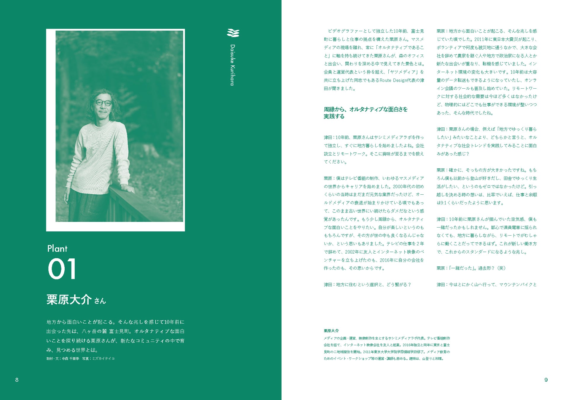 書籍では、この10年間に森のオフィスに集った会員や関係者へのインタビューを通じ、彼らのライフストーリーや森のオフィスを通して生まれた働き方や生き方の変化を描きます。コワーキングスペースを単なる施設として運営するのではなく、そこで育まれる人間関係を「生態系」、その基盤となる環境や価値観を「土壌」と捉える、森のオフィス独自の思想が合計96ページの中で紹介されています。