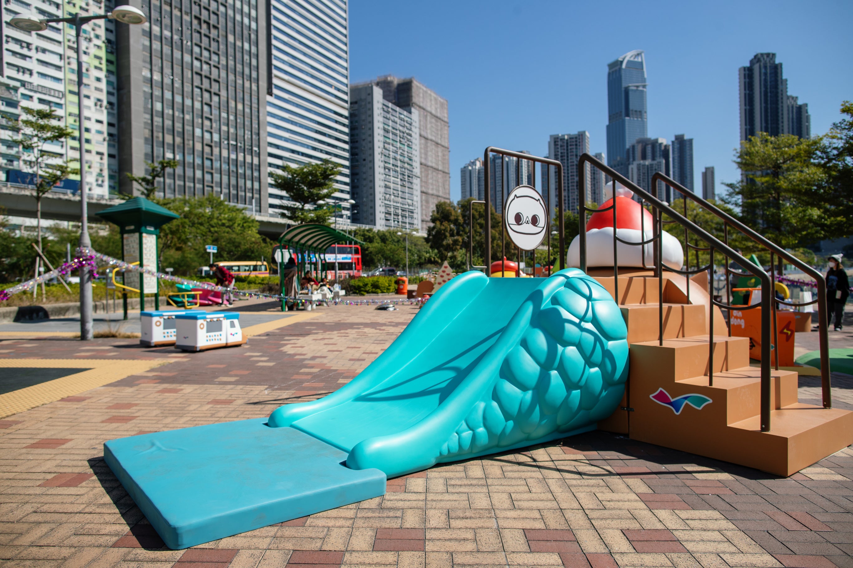 「Din-Dong」マーメイドは荃湾海浜エリア(Tsuen Wan Waterfront Park)にあまりに長い間いるため、太平洋で数千年一緒にいたお姉ちゃんに会いたくなりました。そこで、「Din-Dong」はお姉ちゃんを呼び、陸で一緒にクリスマスのお祝いをすることにしたのです!お姉ちゃんは「Din-Dong」と協力して、子どもたちが背中に乗ったり、滑り台で遊んだりできるよう、滑り台に変身しました!
