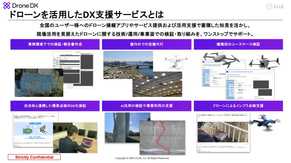 CLUEはDroneRooferなどのサービスとドローン活用の知見を活かして、自治体と協業してドローンを活用したインフラ点検の効率化、防災・災害復興への活用の促進などの取り組みを行なってきました。