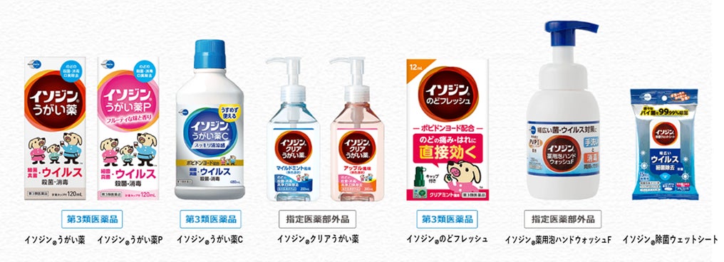 イソジン®うがい薬 各種、イソジン®クリアうがい薬 各種、イソジン®のどフレッシュ 各種、イソジン®きず薬、イソジン®軟膏、イソジン®薬用泡ハンドウォッシュ、イソジン®除菌ウェットシート 各種