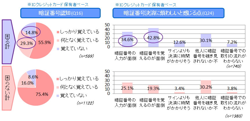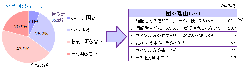 PINバイパスが無くなった場合に「困る計」は、35.2%です。困る理由は「暗証番号」の不認知に関する内容が上位を占めます。(図表10)