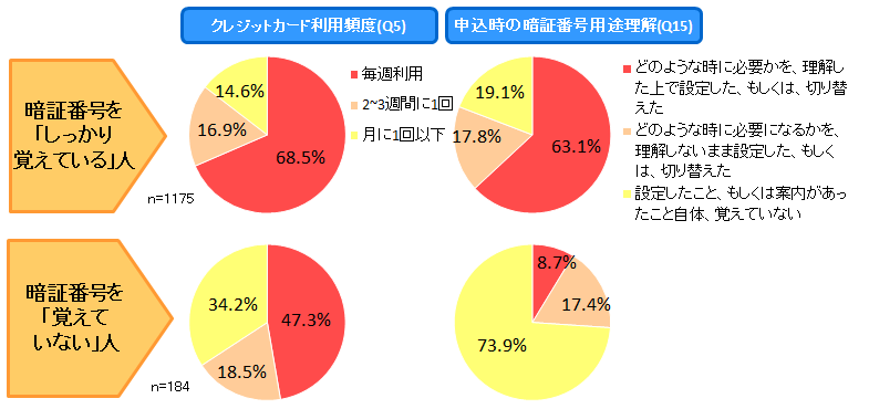 暗証番号をしっかり覚えている人は、クレジットカードの利用頻度が多く、クレジットカード申込時に暗証番号の必要性を理解していることがわかります。(図表6)