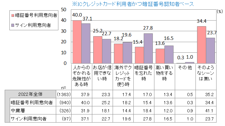 暗証番号を入力したくないシーンで、暗証番号利用意向者と比較して、サイン利用意向者は「暗証番号を忘れた時」が27.8%と高いです。(図表8)
