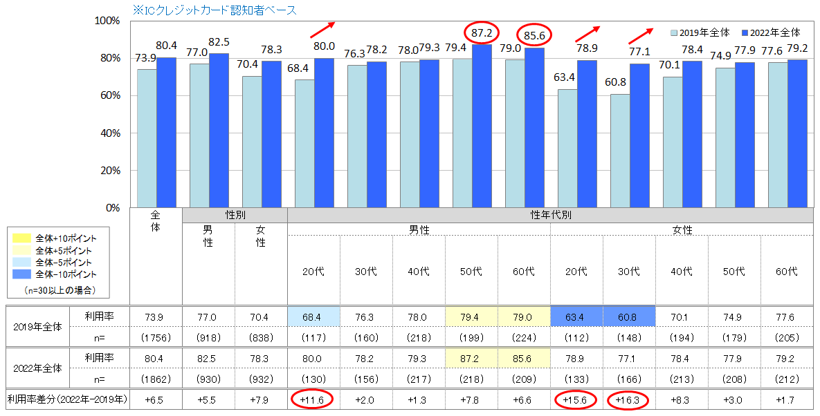 ICクレジットカードの利用伸長率は、全年代で6.5%増加、男性20代、女性20~30代が10%以上増加し、