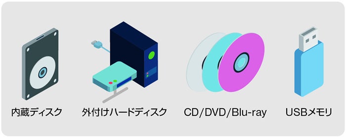 内蔵/外付けハードディスク、NASなどのネットワークドライブ、CD/DVD/Blu-ray など