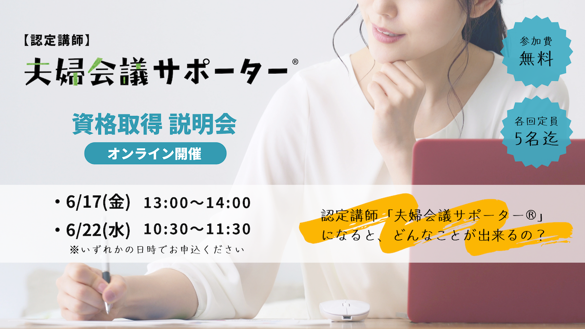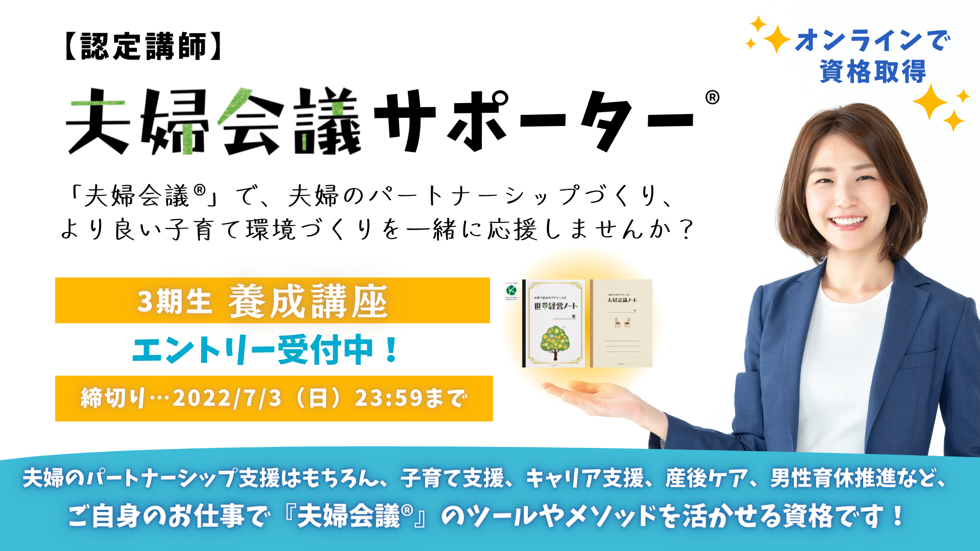 家庭内のより良い子育て環境づくりの鍵を握る資格、認定講師『夫婦会議サポーター』3期生オンライン養成講座のエントリー受付中!
