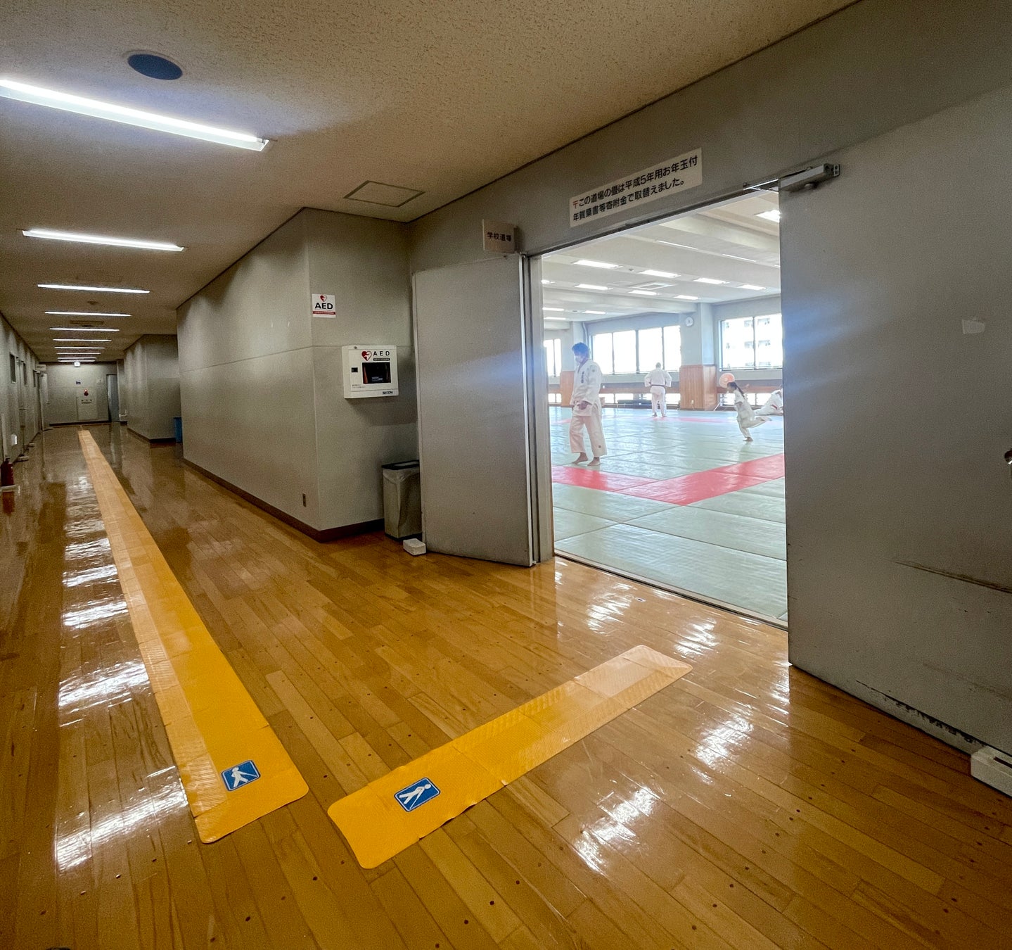 講道館では、道場からトイレまでの約35メートルの区間に『歩導くんガイドウェイ』を設置しました。柔道の総本山である講道館は、選手たちが日頃から慣れ親しんだ場所ですが、導線に誘導マットを敷設することで、選手が試合に集中できる環境が提供できるとNPO法人日本視覚障害者柔道連盟の初瀬会長は述べています。