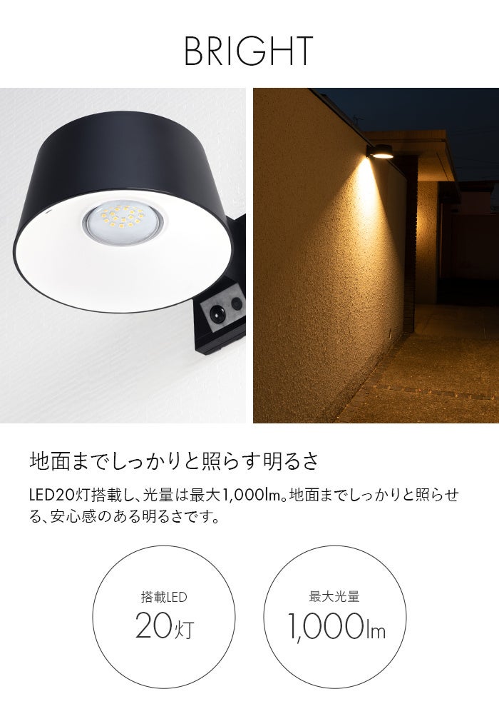 最大光量はなんと1,000lm。20灯のLEDが地面までしっかりと照らします。雰囲気の演出だけでなく、帰宅時に足元や手元が見えづらい時や、防犯、夜間のお庭作業などにも最適です。